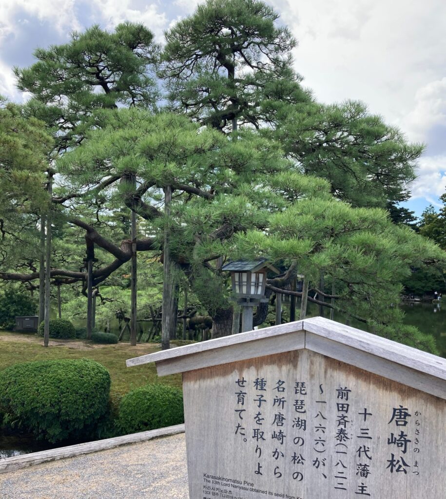 その兼六園の唐崎松は、第13代加賀藩主・前田斉泰が、滋賀県・琵琶湖畔の名松「唐崎の松」から種子を取り寄せて育てたものだそうです。