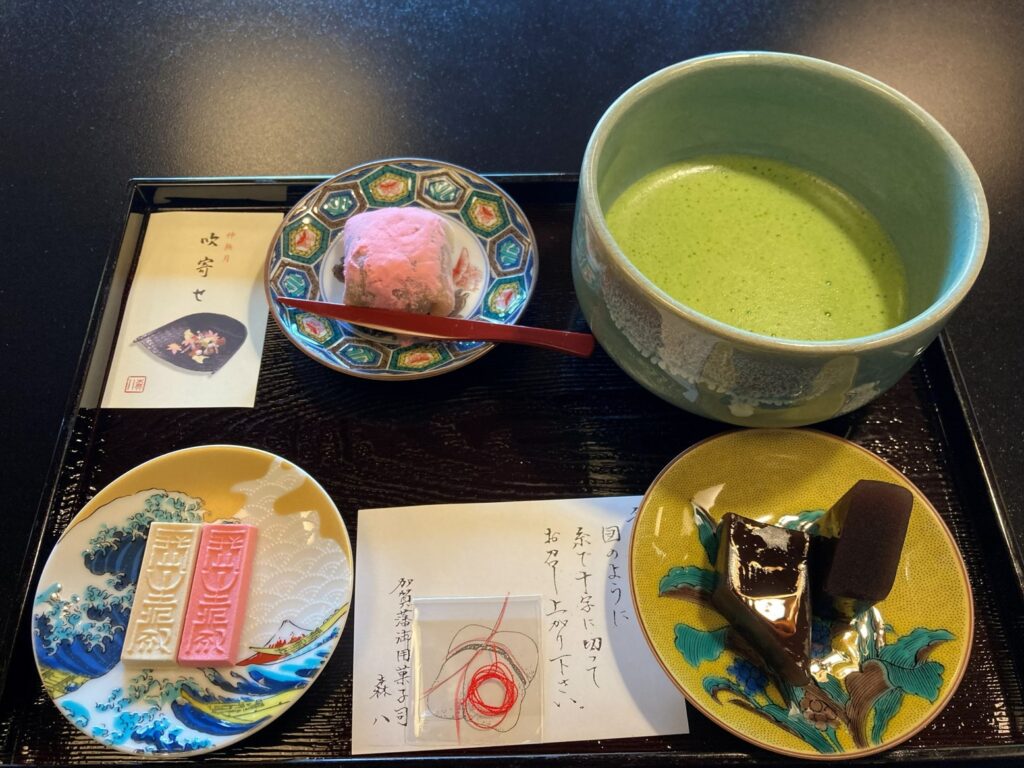 長生殿、千歳、黒羊羹と抹茶のセット「400周年記念プレート 伝統」をいただきました。